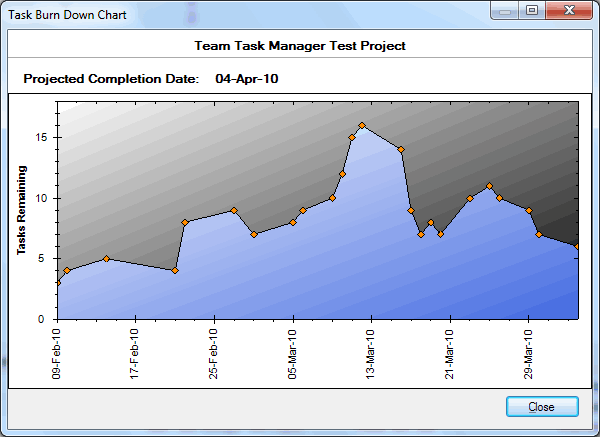 Facendo doppio clic sul Task bruciare Grafico apre in una nuova finestra. Il Proiettata Data di completamento predice quando sarà completato il gruppo di progetto o attività. Ad esempio, si supponga che un progetto ha 20 compiti che devono essere completati entro 30 giorni, cioè dal 01-30 Gennaio, 2010 10 Se le attività sono completate dal 20 gennaio 2010 poi il Media Task Completion tasso è di 0, 5 compito al giorno. Secondo questo calcolo, le attività rimanenti saranno completati entro 20 giorni dal 20 gennaio 2010, dunque, il Proiettata Data di completamento per il gruppo di progetto o compito sarà 9 febbraio 2010.