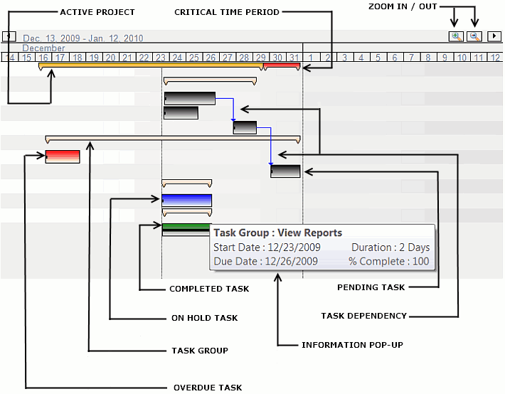 Informazioni come la data di inizio, data di scadenza e percentuale di completamento viene mostrato quando si passa il mouse su un progetto, gruppo Task o Task. È inoltre possibile aggiungere, modificare o rimuovere un Task dipendenza dal diagramma di Gantt. Fare riferimento alla data immagine qui sotto per vedere le varie voci del tempo e componenti importanti del diagramma di Gantt.