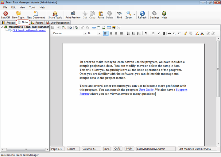 La Task Team Manager Note sezione ti permette di condividere le informazioni con i membri del team in modo rapido e semplice. In generale, la condivisione di documenti di progetto o file attraverso una rete non può essere abbastanza sicuro. C'è la possibilità dei documenti in fase di modifica o manomissione da parte di altri utenti.
