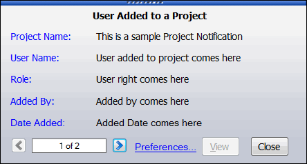 Il Finestra di notifica è un avviso visualizzato nell'angolo in basso a destra del desktop. La finestra sarà mostrato per un predefinito di 15 secondi, anche se questo può essere cambiato. Durata massima di vista notifica è di 999 secondi. Cliccando sul Visualizza pulsante apre la voce che siete stati informati circa. Se più di una notifica ricevuta, allo stesso tempo, è possibile utilizzare i tasti freccia sinistra e destra per vederlo.