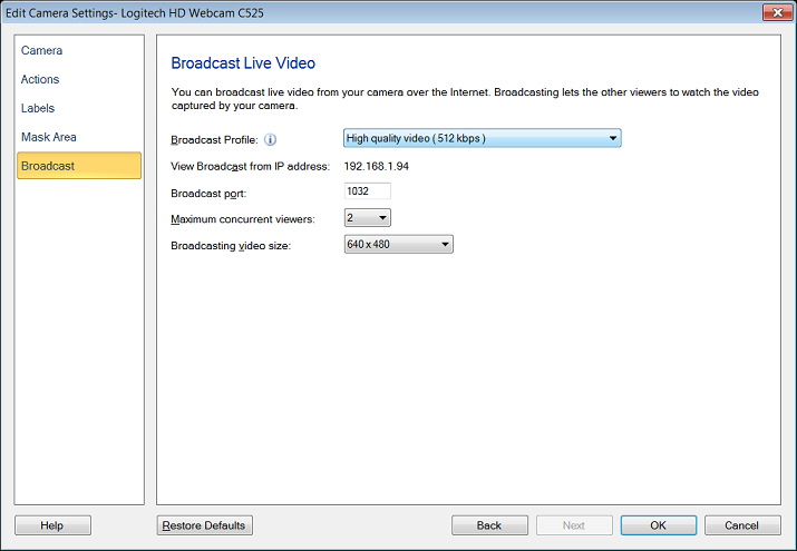 Broadcasting consente agli altri utenti di connettersi al PC in esecuzione WebCam Monitor e visualizzare il video dal vivo. SPAZIOIl numero di utenti che possono connettersi è limitato dalla larghezza di banda della connessione a Internet e le risorse del PC. Broadcasting utilizza la tecnologia avanzata di streaming di Windows Media per fornire i migliori media di qualità trasmessi.