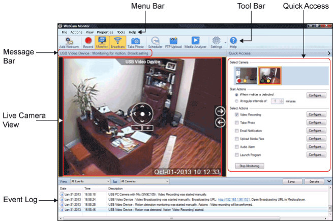 Tutte le funzionalità di WebCam Monitor possono essere accedute da Barra dei menu.