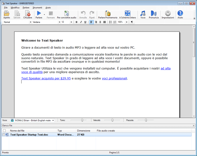 Poiché Text Speaker ha funzioni di elaborazioni di testo, si può creare e modificare i documenti senza l’utilizzo di qualsiasi altro programma. È anche possibile modificare e salvare documenti di Microsoft Word senza avere il bisogno di una copia di Word installato.