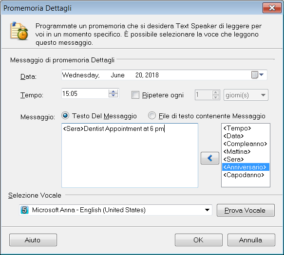 Abbiamo anche aggiunto promemoria vocali. Non perderai mai un altro appuntamento con i promemoria vocali! Il computer parlerà e visualizzerà un messaggio in qualsiasi momento che si seleziona. È possibile ripetere il messaggio a qualsiasi intervallo che si sceglie, da un minuto a un anno.