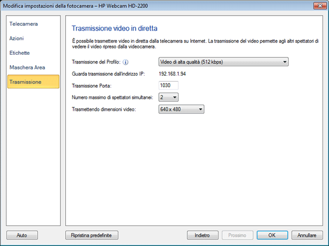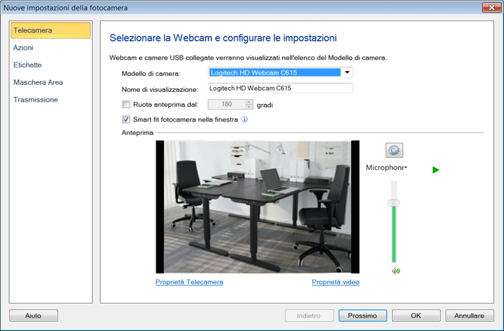 | Regolare le proprietà video e fotocamera delle singole webcam |