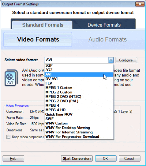 Vídeo 3GP, AVI (incluindo DivX e MPEG-4), DV-AVI (Digital Video AVI para padrões PAL e NTSC), Flash Video (FLV), MP4 (incluindo Sony PSP e Apple iPod), MPEG-1, MPEG-2 formatos (VCD, SVCD, DVD em padrões tanto PAL e NTSC), MOV (QuickTime), vídeo da inquietação (SWF), WMV (Windows Media Video)