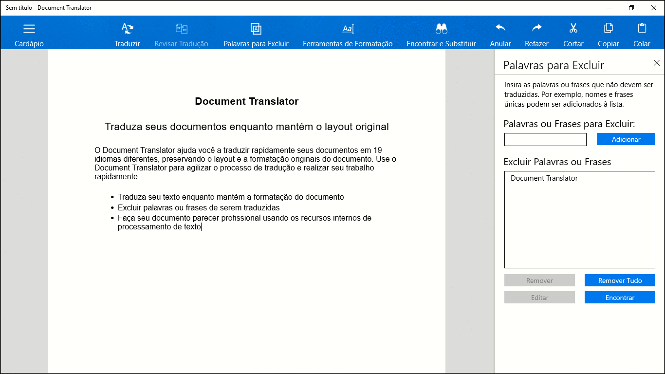 Basta escolher um documento, selecionar o idioma e permitir Document Translator Além do mais, você pode excluir várias palavras ou frases da tradução. Este aplicativo permite que você evite a tradução de determinadas palavras ou frases, como nomes de lugares, produtos e pessoas. Basta adicionar a palavra à lista e o Document Translator Traduzir seus documentos nunca foi mais rápido e fácil antes.