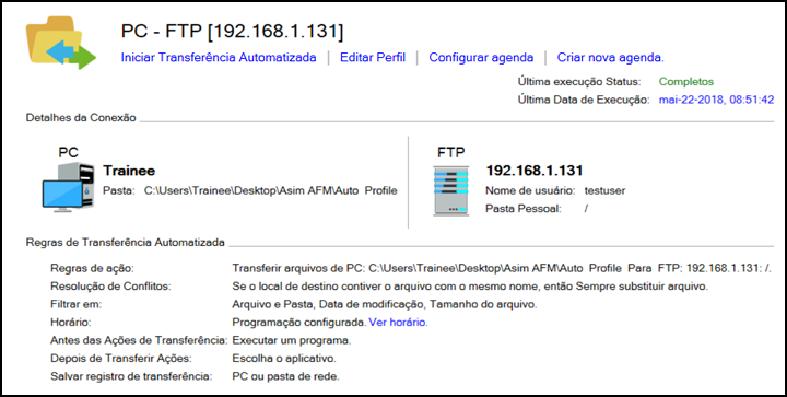 - Informação de conexão: Este painel exibe os detalhes da conexão do perfil selecionado, como pasta de origem e destino, endereço IP, protocolo, etc.A localização da pasta selecionada está ativada: