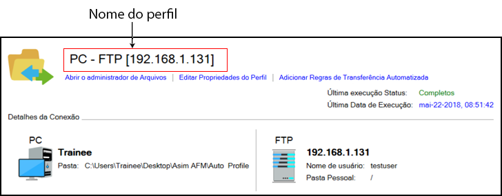 A página Informações do perfil exibe as informações sobre o seu perfil, como tipo de transferência, origem, local de destino e data da última conexão.Para ver as propriedades da conexão, clique com o botão direito em um perfil Painel de perfil de conexão e selecione Informação do Perfil.