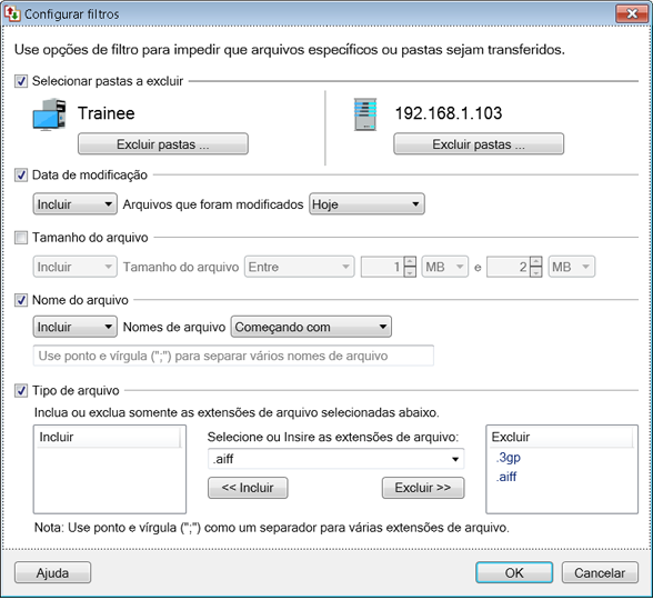 Com os Filtros, você pode optar por transferir apenas determinados tipos de arquivo (por exemplo, arquivos .doc do Microsoft Word) ou enviar tudo, exceto determinados tipos de arquivo (por exemplo, você pode optar por não transferir arquivos de backup do Word [.wbk]). Por padrão, todos os tipos de arquivos são incluídos na transferência automatizada de arquivos.Com a opção de filtros, você pode especificar as pastas que não deseja incluir na transferência e também decidir se os arquivos do tamanho específico ou da data de modificação devem ser incluídos na transferência ou não.Além disso, você pode usar o caractere curinga "*" para selecionar arquivos com base em padrões em seus nomes.Os cinco tipos de filtros que você pode definir para arquivos durante a transferência automatizada são Selecione pastas para excluir, Modificação de data, Tamanho do arquivo, nome do arquivo e Tipo de arquivo.