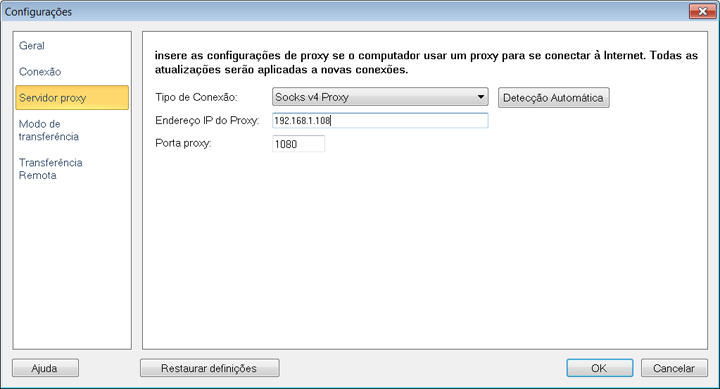 Um servidor proxy permite que você se conecte ao servidor de destino usando-o como uma camada intermediária.Encaminha suas solicitações para o servidor de destino e retorna a resposta para você.  Auto FTP Manager permite que você se conecte via proxy 4 e 5, HTTP ou conexão de proxy FTP. Se você estiver por trás de um servidor proxy, defina essas configurações no aplicativo para se conectar ao seu servidor FTP.