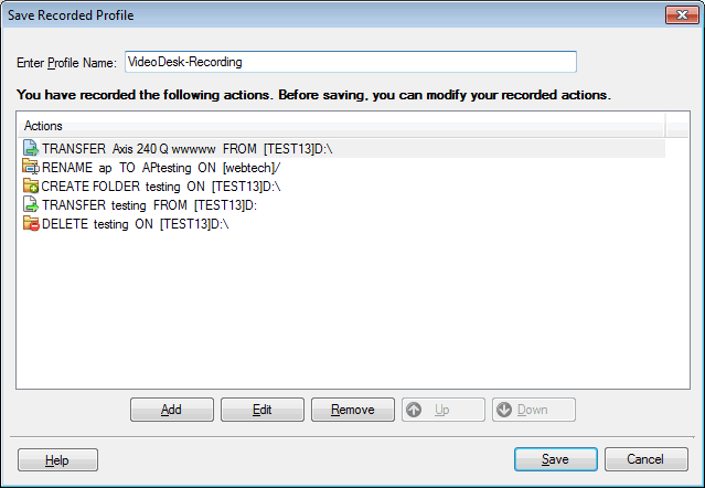 Você pode editar, adicionar novas acções e executar outras operações no perfil gravado. Este perfil não tem regras de ação, resolução de conflitos, filtros e incluir/excluir opções subpasta como em um Automated Transfer perfil padrão. Em vez disso, você pode adicionar ou editar ações específicas como "Copiar arquivo name.ext da pasta 1 para pasta 2."