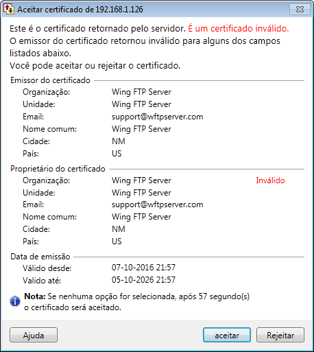 Se alguma exceção for recebida do lado do servidor para emissor, proprietário ou datas, Auto FTP Manager será exibido Inválido contra o primeiro campo da respectiva seção no certificado como mostrado acima. Para algumas exceções desconhecidas, Auto FTP Manager mostrará o Certificado Inválido, mas sem Inválido rótulo.