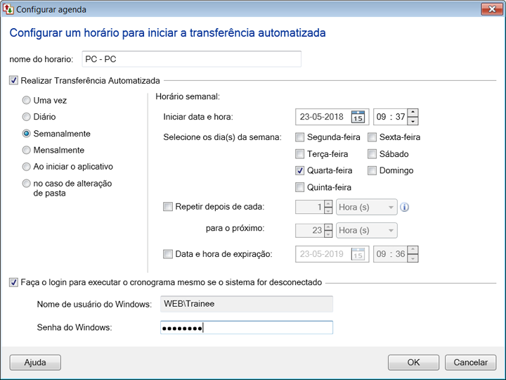 As tarefas de transferência podem ser programadas para ser um um tempo evento, ou ocorrer diariamente, semanal ou por mês. Usando também No lançamento do aplicativo, você pode executar o agendamento toda vez que o programa for iniciado.Além disso, com a ajuda de Na mudança de pasta, a agenda será invocada quando ocorrer alguma alteração na pasta.