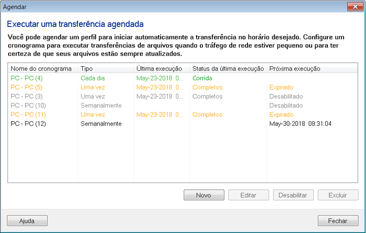 Agendador ajuda você a visualizar os detalhes das programações enquanto cria ou edita o perfil de transferência automatizado.Isso é útil para ver quais programações já estão configuradas para este perfil, tipo de planejamento, última execução e próximo status de execução.