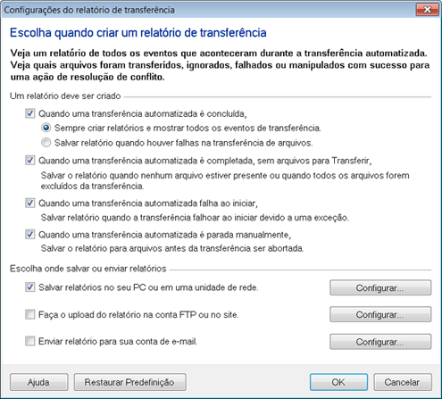 Você pode optar por salvar cada relatório ou apenas aquele que foi criado quando ocorreu uma falha na transferência do arquivo.  Salvar localização: Decida o local para salvar os relatórios de transferência.Você pode escolher qualquer um ou todos os locais a seguir