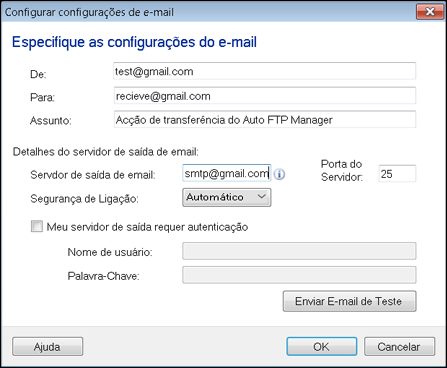 Se você optar por enviar o relatório como e-mail, insira os detalhes do e-mail.  Informação de Mailing requer que você especifique os endereços de e-mail do remetente e do destinatário.Você pode incluir vários receptores separados por uma vírgula.