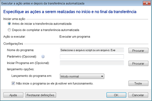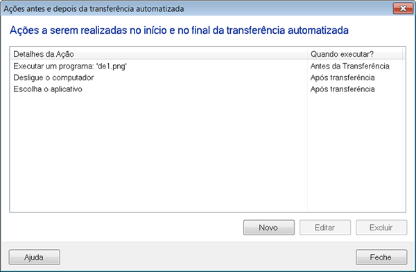 Você pode querer que uma ação específica seja executada antes ou depois de uma transferência de arquivo.Você pode configurar ações como executar um determinado programa, fechar o aplicativo ou desligar um computador.