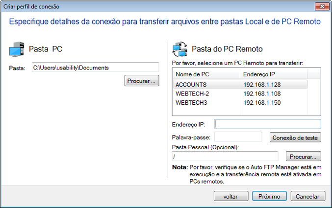 3 Se você estiver transferindo arquivos entre PC pasta e PC Remoto, você precisa fornecer o caminho da pasta e detalhes da conexão do PC remoto, conforme mostrado abaixo: