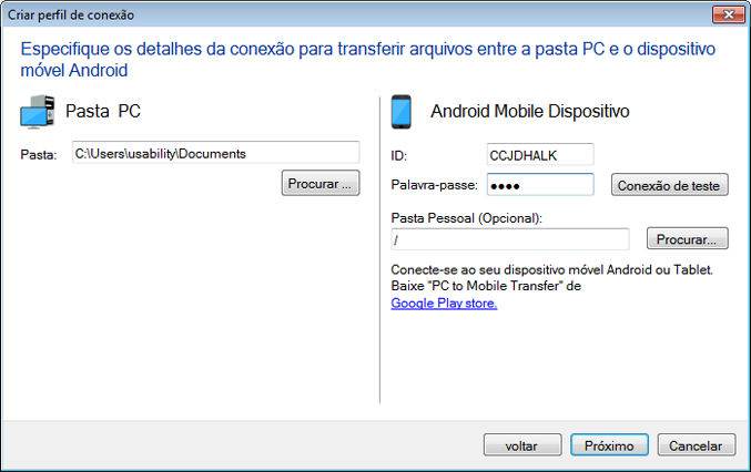 2 Se você estiver transferindo arquivos entre PC pasta e Móvel dispositivo, você precisa fornecer o caminho da pasta e os detalhes da conexão móvel, conforme mostrado abaixo: