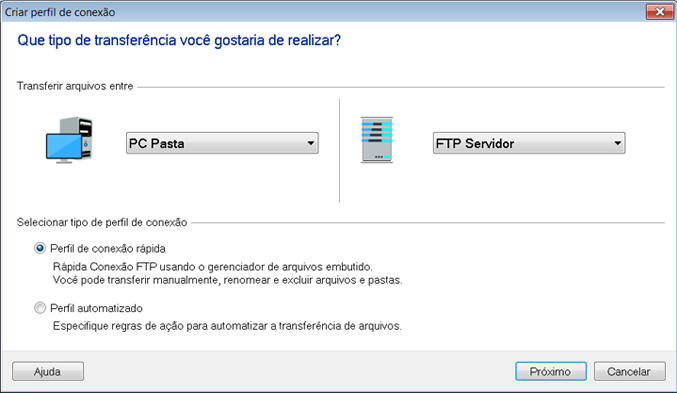Escolha o tipo de perfil de conexão como Perfil de Conexão Rápida ou Perfil Automatizado. Perfil de conexão rápida permite que você use o Gerenciador de arquivos para transferir arquivos manualmente entre pastas usando Fila de transferência. A janela Gerenciador de arquivos é dividida em dois painéis, cada um mostrando uma interface no estilo do explorador.Os arquivos podem ser arrastados de um painel e colocados em outro, facilitando a transferência. Perfil Automatizado é usado para transferir automaticamente os arquivos entre a pasta selecionada.Por exemplo, se você deseja transferir arquivos automaticamente entre uma pasta do PC e um servidor FTP, é necessário regras automatizadas depois de fornecer o caminho da pasta e os detalhes da conexão FTP.Abaixo, os exemplos ajudarão você a configurar perfis de conexão de PC para FTP, PC para Mobile e PC para PC remoto.