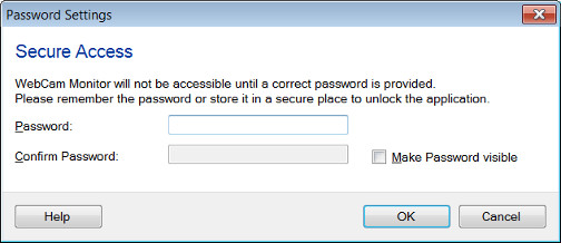 Defina uma senha e ninguém mudará as configurações da aplicação sem o seu consentimento. As câmeras estarão disponíveis para o usuário visualizar. Uma vez que o aplicativo está bloqueado, o usuário não poderá fechar Webcam Monitor. A seleção desse recurso bloqueará os ajustes de aplicativos em Está bem clique. Uma vez que o usuário desbloqueia o aplicativo, o Acesso seguro A opção será desmarcada.
