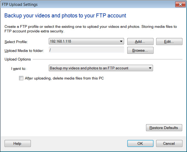 Clique em Adicionar Para criar um novo perfil de FTP. Para Editar Configurações da conta FTP, selecione o Perfil FTP na lista suspensa.