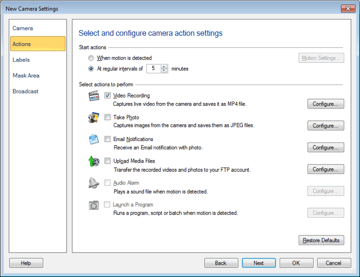Clique com o botão direito na visualização da câmera, selecione Editar câmera >> Ações E selecione Em intervalos regulares de n minuto (s) opção.