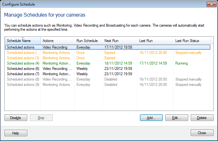 Com a ajuda de WebCam Monitor, você pode definir horários individuais para cada câmera. ESPAÇOVocê pode agendar cada câmera de forma independente para executar várias ações, como monitoramento com alertas ou gravação de vídeo, captura de fotos e transmissão. Você pode Adicionar, Editar Um cronograma de acordo com sua necessidade. Se você não deseja que uma programação seja executada em horário especificado, Desactiver (Quando a programação não está sendo executada), ele ou Parar (Quando o horário está sendo executado). Quando você não deseja executar uma programação em uma câmera, selecione Excluir.