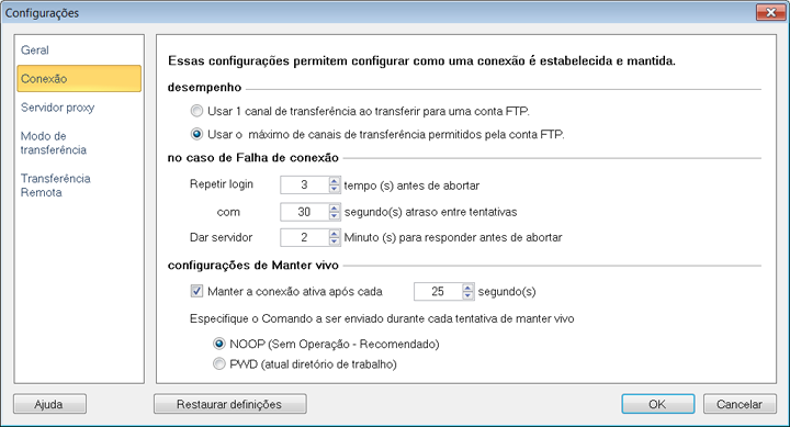 Nota: Alguns servidores FTP não suportam o comando NOOP e podem fechar a conexão mesmo depois de receberem o comando NOOP FTP regularmente.Para tais servidores FTP, recomenda-se usar o comando PWD para Keep Alive.