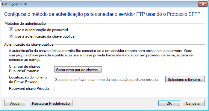 - Localização do caminho da chave pública e privada: Por padrão, as chaves serão geradas e salvas no seu PC em Documents >> Auto FTP Manager >> Keys. Você tem a opção de alterar a pasta padrão clicando em Mudar pasta.