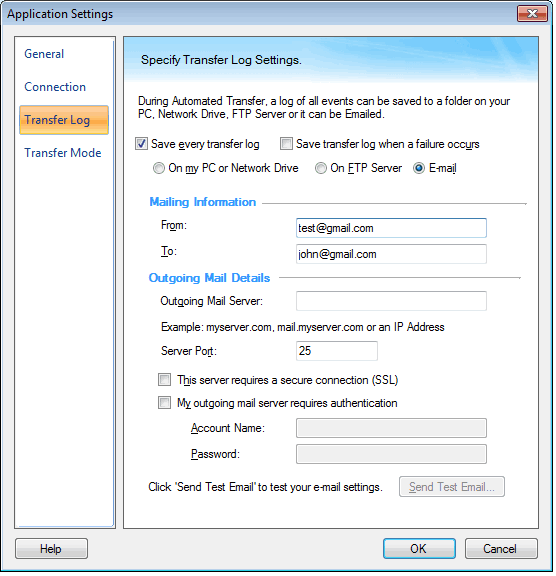 You can set Auto FTP Manager to save the transfer log after each Automated Transfer. O log pode ser salvo para seu PC, uma unidade de rede ou um servidor FTP. Além disso, também é outra opção que permite que você envie o log como um e-mail.