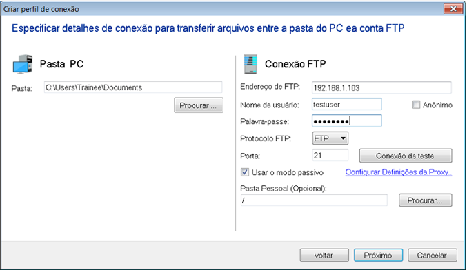 1 Se você estiver transferindo arquivos entre PC pasta e FTP servidor, você precisa fornecer o caminho da pasta e os detalhes da conexão FTP, conforme mostrado abaixo: