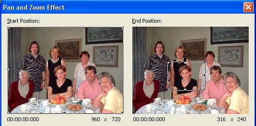 Se você deseja destacar uma parte específica da imagem, enfatize, zoom sobre ele. Clique duas vezes sobre o Posição inicial caixa para que o retângulo inclui a tela inteira. Agora mova o Posição final retângulo para a área que deseja ampliar. (Na ilustração, a mulher em preto na mesa.) Quando você reproduzir o vídeo, a cena começa com toda a família está sendo mostrada. A imagem gradualmente muda e restringe a concentrar-se na mulher.