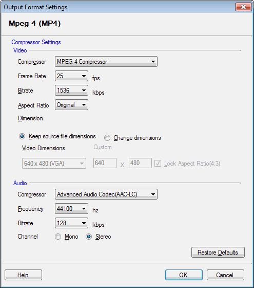 Os arquivos MP4 são salvos usando MPEG-4 compressor. A taxa de quadros é definida como 25 Fps, Bitrate em 1536 Kbps Para o formato de arquivo MPEG 4 personalizado. Para MPEG 4 HD, A taxa de bits é definida para 6000 kbps. Por padrão, o vídeo é criado em uma proporção de aspecto de exibição 4: 3. Você pode optar por reter ou alterar as dimensões do vídeo.