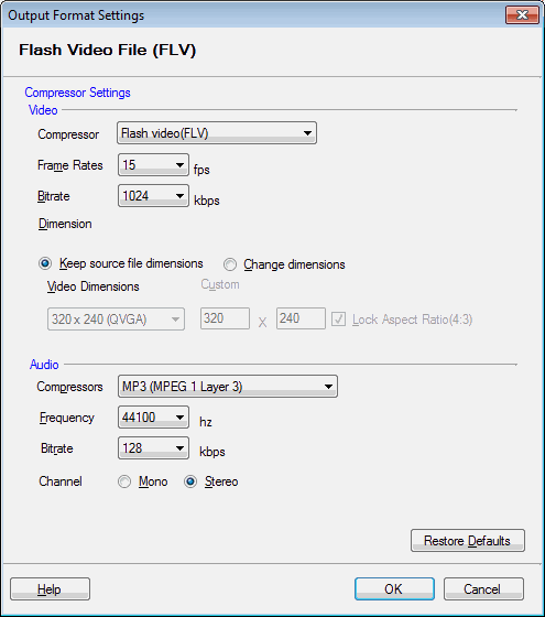 Por padrão, o compressor que é selecionado é Vídeo em Flash. A taxa de quadros é definida em 15 fps, Bitrate em 200 kbps. Você pode optar por reter ou alterar as dimensões do vídeo.