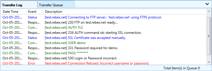 O log de transferência contém 3 colunas - Data hora, Eventos e Descrição. Quando ocorre um evento, a data e a hora do evento são registradas. A Descrição do evento fornece informações adicionais sobre o evento. As mensagens do log de transferência são divididas em diferentes eventos. Diferentes cores são usadas para indicar cada tipo de evento.