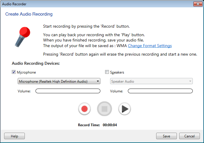 Ajuste o volume de gravação usando o controle deslizante. Crie sua gravação de áudio usando o Gravar / Pausar, Pare e Toque botões. Use o Toque botão para verificar o arquivo gravado. Selecione um nome para sua gravação de áudio e escolha uma pasta para salvá-la.