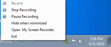 a gravação é para clicar com o botão direito do mouse no ícone My Screen Recorder na bandeja do sistema.
