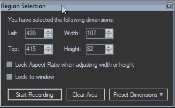 À medida que você está selecionando a região a gravar, você pode ver um conjunto de dimensões listando a largura e a altura da área de captura.No Caixa de seleção de região você pode personalizar a largura ea altura das dimensões de captura.