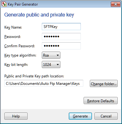 No Gerador de par chave diálogo, você pode criar sua própria chave pública e privada para conexões SFTP.