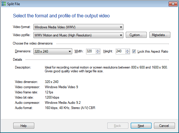 Selecione o formato de arquivo que você deseja para as divisões da Formato do vídeo na lista suspensa. Quando você seleciona um perfil do Perfil de vídeo a lista, seus detalhes como o nome do compressor de áudio e vídeo, a taxa de bits de vídeo e a taxa de quadros, e o formato de áudio é exibido no Detalhes seção. Você pode criar seu próprio perfil personalizado clicando o Personalizada botão.