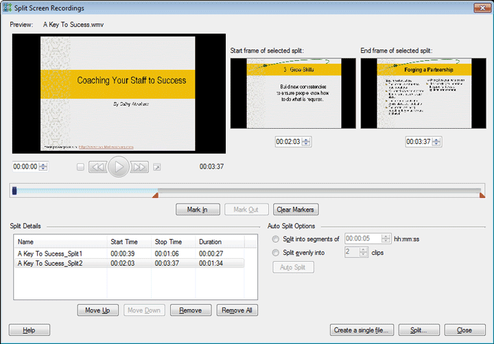 Você pode dividir um arquivo manualmente em qualquer número de peças. No Assistente de gravação de tela dividida, você pode visualizar o vídeo que tem que ser dividida. Marcadores são fornecidos para selecionar o frame inicial e final de cada divisão. Criar um segmento movendo o controle deslizante para a posição desejada e clique no Marcar no e Mark Out botões para selecionar os quadros inicial e final do segmento.
