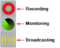 Os ícones de status permitem verificar quais ações estão sendo executadas para a câmera selecionada e iniciar e parar rapidamente as ações.