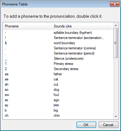 Text Speaker inclui os fonemas do idioma inglês (e muitos outros idiomas europeus). Para ver uma lista de fonemas disponíveis, clique no Gráfico de fonemas botão.