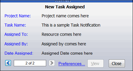A Janela de Notificação é um alerta aparece no canto inferior direito da área de trabalho. A janela será mostrada para um padrão de 15 segundos, embora isso possa ser mudado. Duração máxima de vista a notificação é de 999 segundos. Clicando no Ver botão abre o item que você está sendo notificado. Se mais de uma notificação for recebida, ao mesmo tempo, você pode usar teclas de seta esquerda e direita para visualizá-lo.