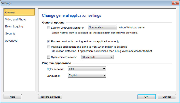 o Geral Seção do Configurações do aplicativo O diálogo controla o comportamento do programa quando é lançado pela primeira vez, a aparência geral do aplicativo e a salvação de vídeos e fotos.
