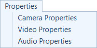 • Menu Propriedades: Mude as propriedades da câmera, do vídeo e do áudio.