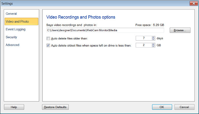Apagar automaticamente os arquivos mais antigos se N GB deixado na unidade: Para evitar o preenchimento completo de um disco rígido, você pode optar por excluir o arquivo mais antigo sempre que Webcam Monitor é lançado, e apenas a quantidade ajustada de espaço livre está disponível.