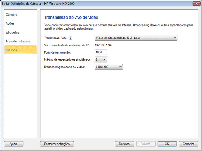 | Ajustar a qualidade do vídeo (tamanho do quadro, taxa de quadros) |